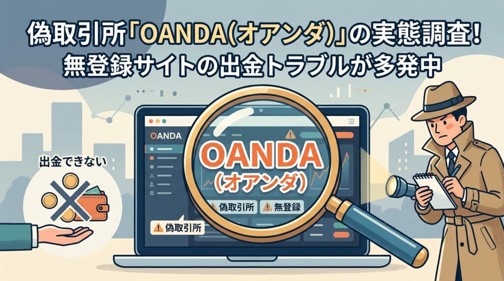 OANDAを騙る偽取引所サイトの実態を調査。無登録・出金トラブル多発中。正規OANDAとの違いと見分け方を解説。金融庁登録確認が鍵!安全投資の鉄則を公開。(98文字)