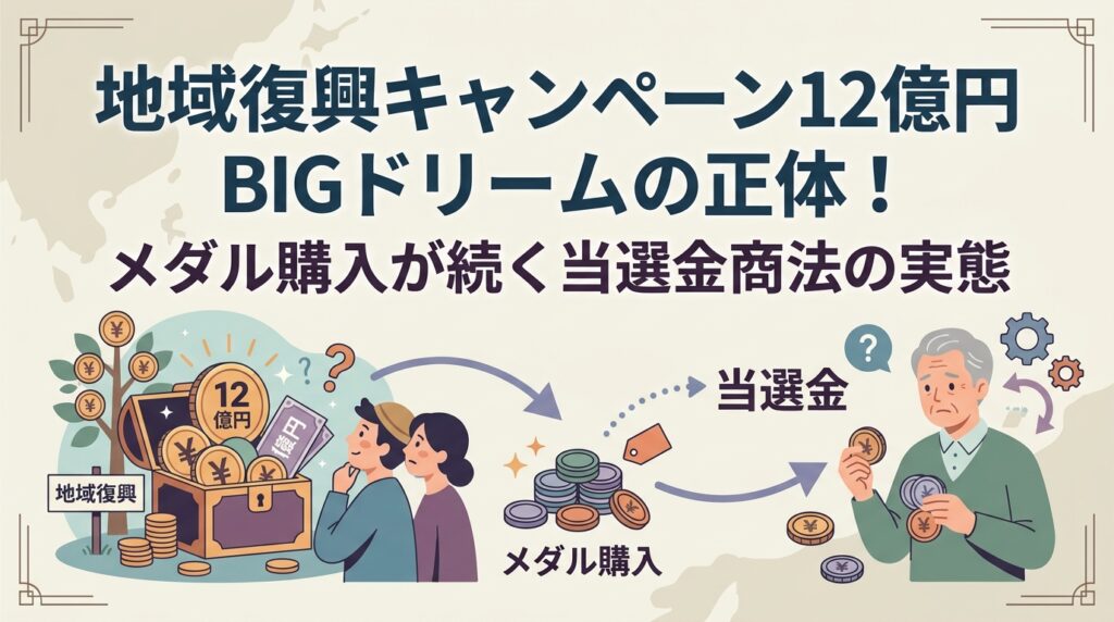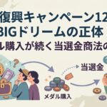 地域復興キャンペーンBIGドリームは12億円当選を餌にメダル購入を要求。固定番号・追加支払いの罠で高リスク。運営不明、口コミなしの実態を検証。安全な副業をおすすめします。(98文字)