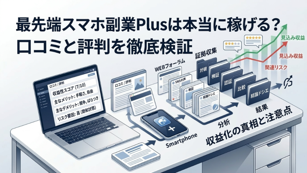 最先端のスマホ副業Plusを徹底検証。運営情報不明、口コミネガティブ、仕事内容曖昧で非推奨。安全な代替副業も紹介。参加前にチェックを。(98文字)